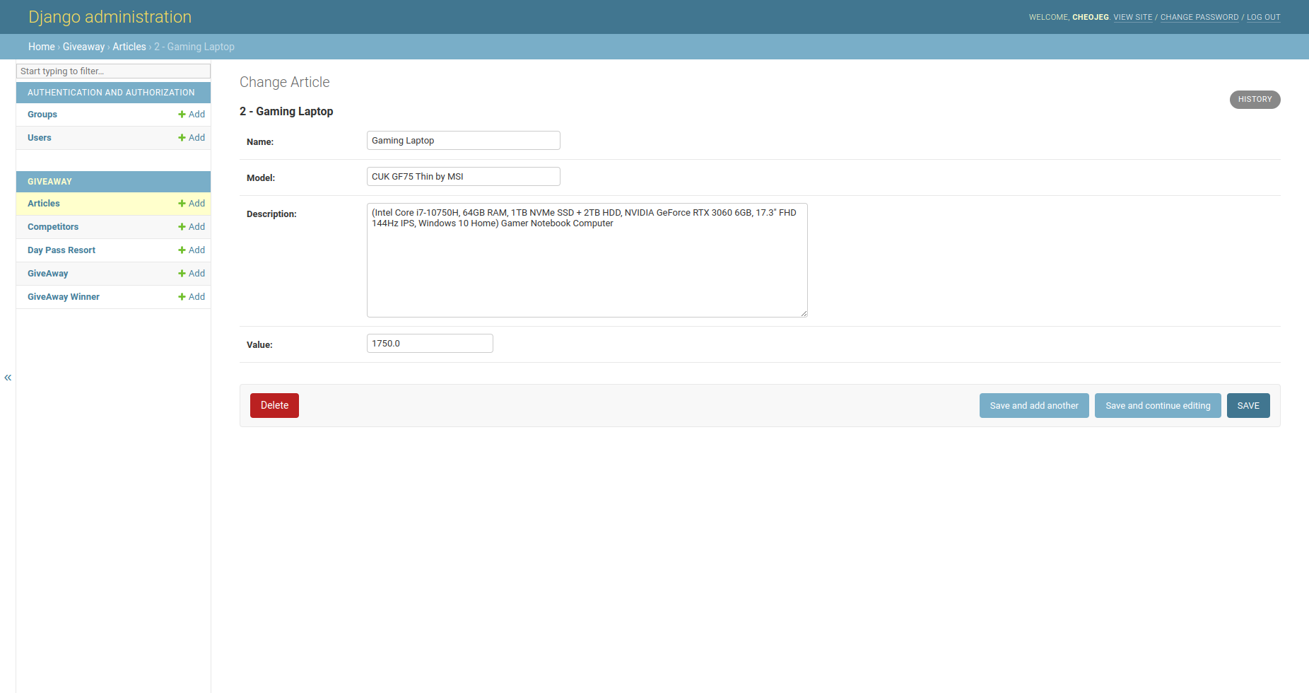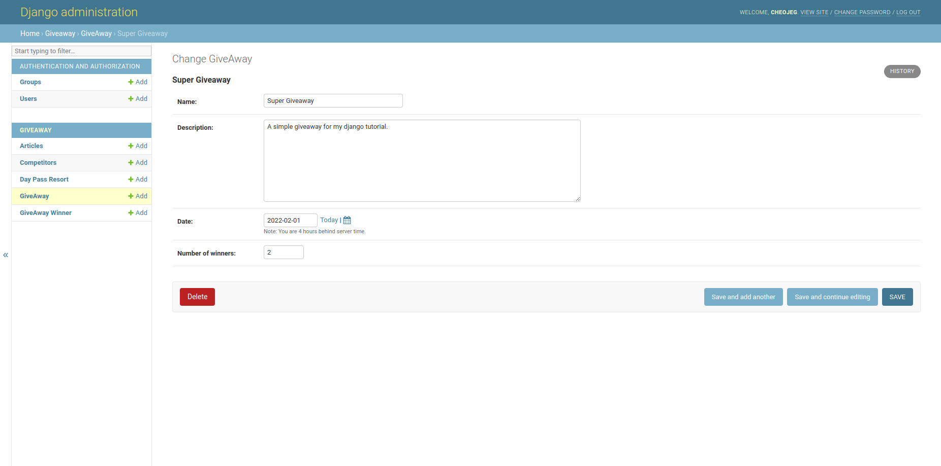 return f'{self.name}'Now to store the winners of a giveaway we need another model that stores the association between a participant, a giveaway and a prize.