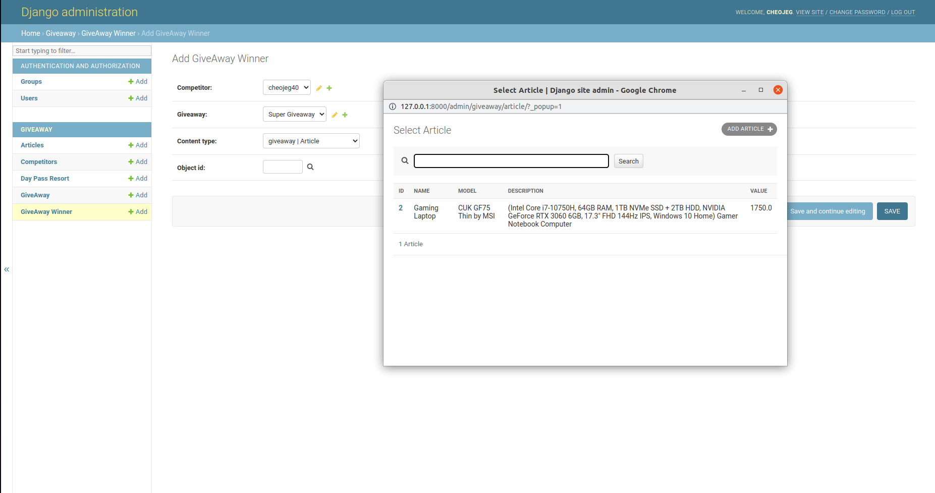 Since there are different types of prizes we need a generic relation for them in the model. To define this relationship, I recommend using django-gfklookupwidget, a package that helps us easily manage this type of relationship from the Django admin.