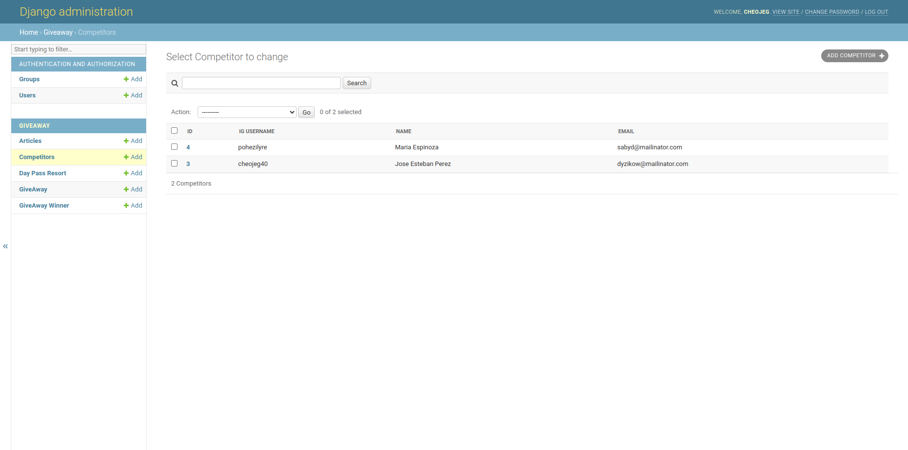 Once our models are defined, we generate and run the migrations, to define the admin that allows us to manage the necessary objects to organize a Giveaway.
