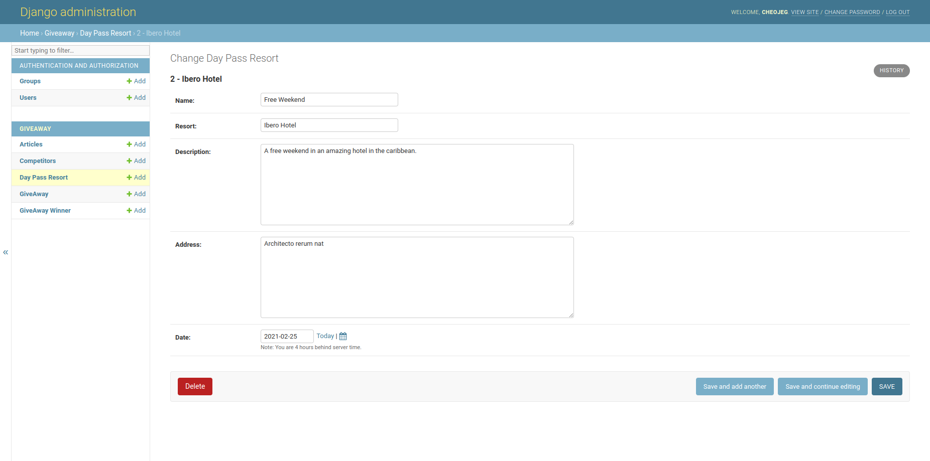 Now we access the admin to create a couple of prizes, an Article and a DayPassResort.